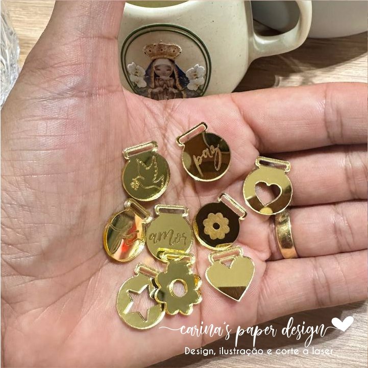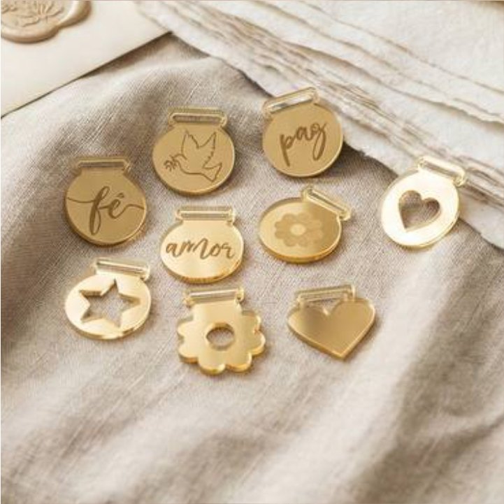 Variedade para sua Coleção: Disponibilizamos diversos modelos para você escolher o que melhor se adapta à sua linha de produção, incluindo palavras de afeto (Fé, Paz, Amor), ícones gravados (pomba, flor) e formatos com recortes vazados (coração, estrela).
