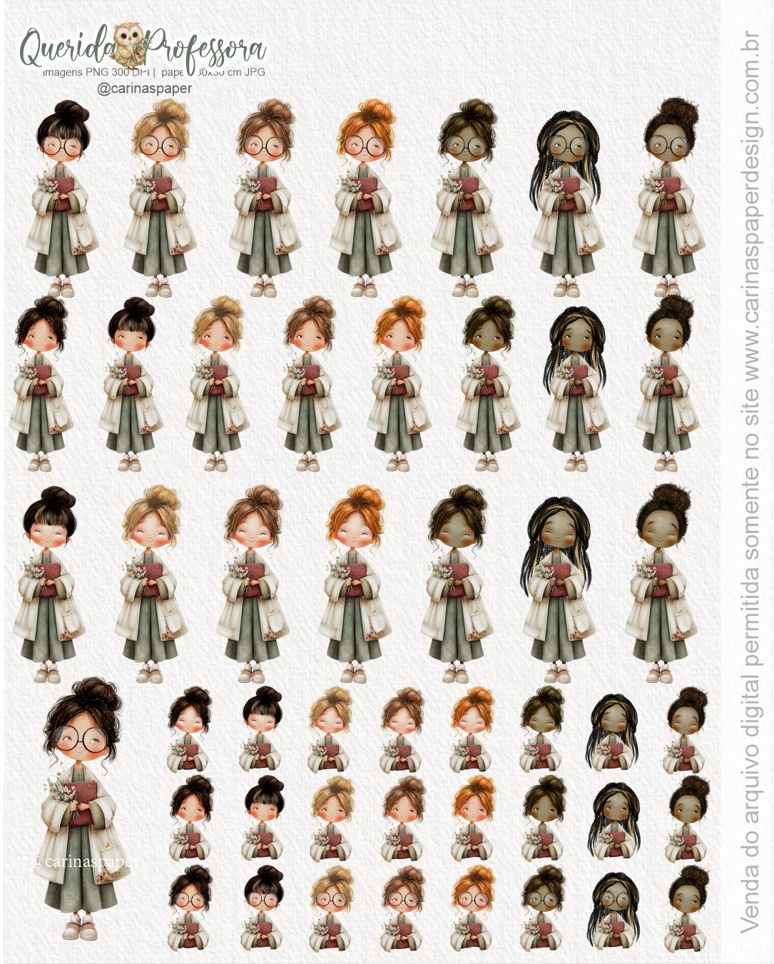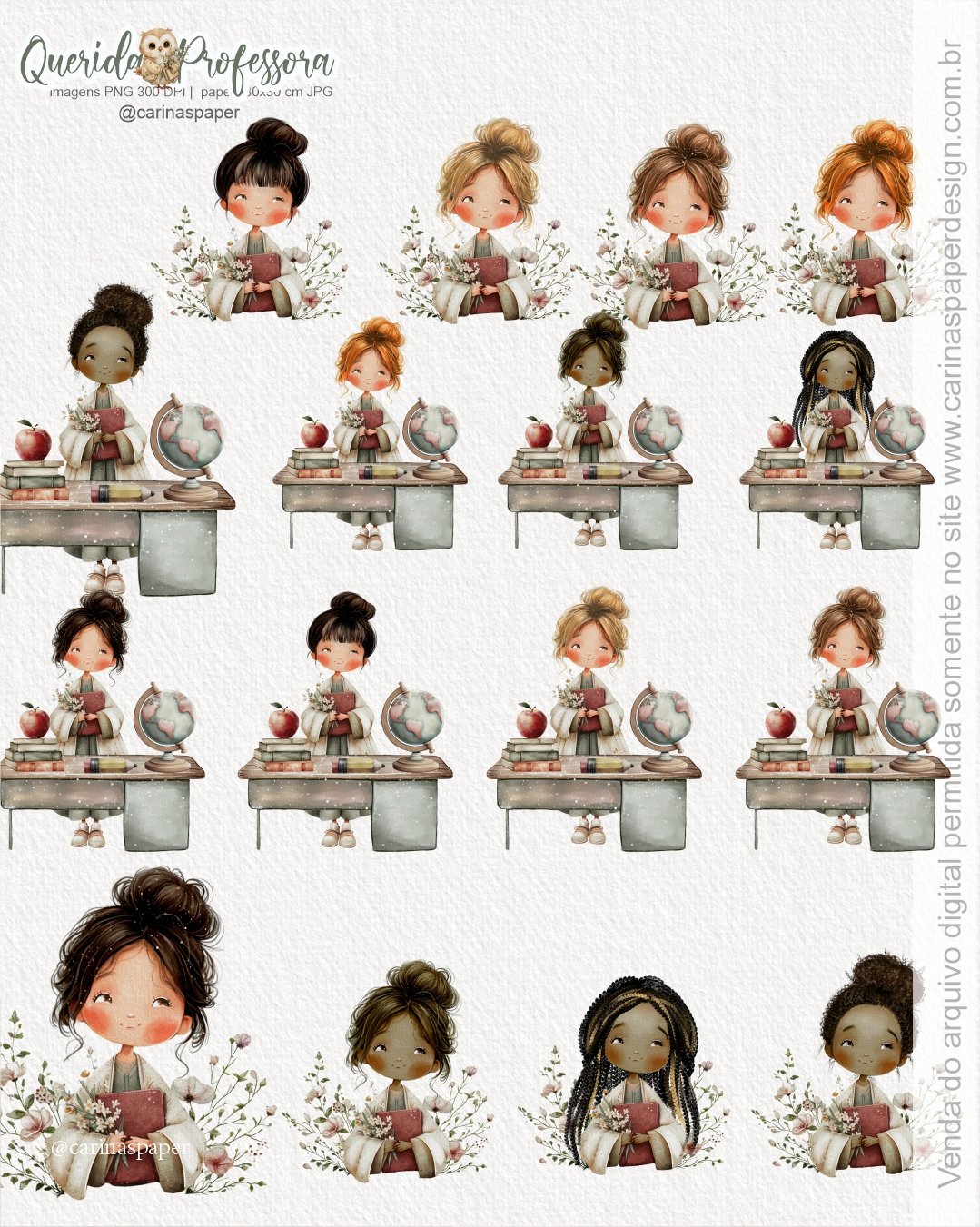 - O Kit contém + de 100 ilustrações (entre ilustrações e textos/frases) em PNG 300 DPI com fundo transparente e 14 papeis digitais tamanho 30,5×30,5 cm PNG com 300 DPI