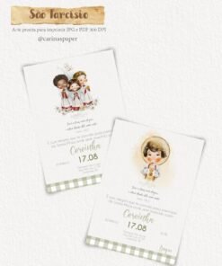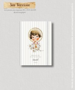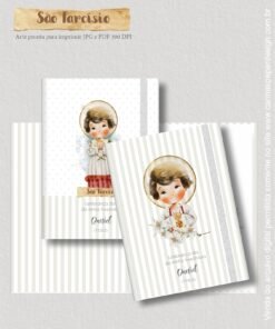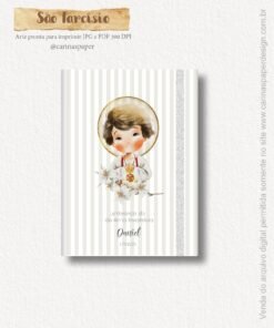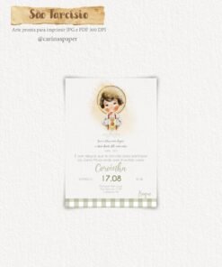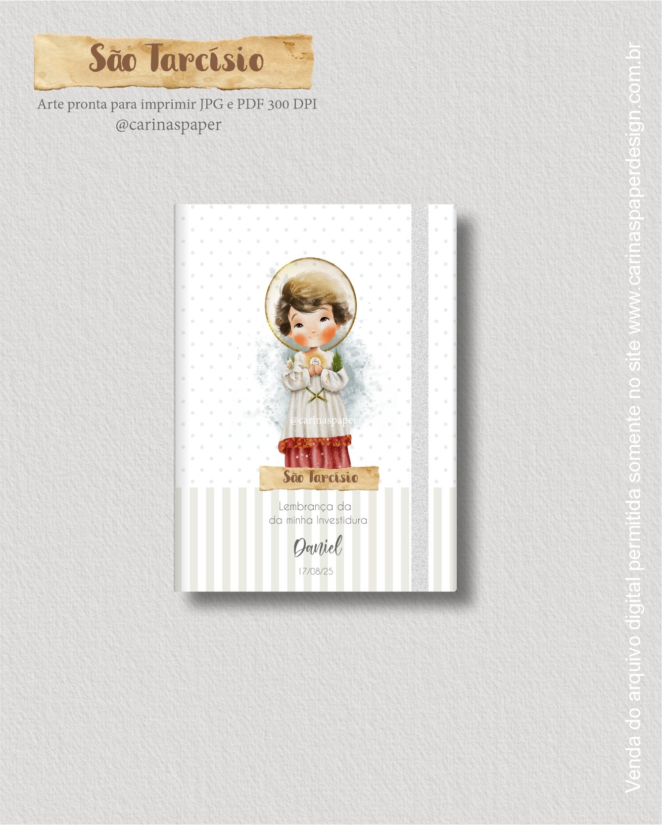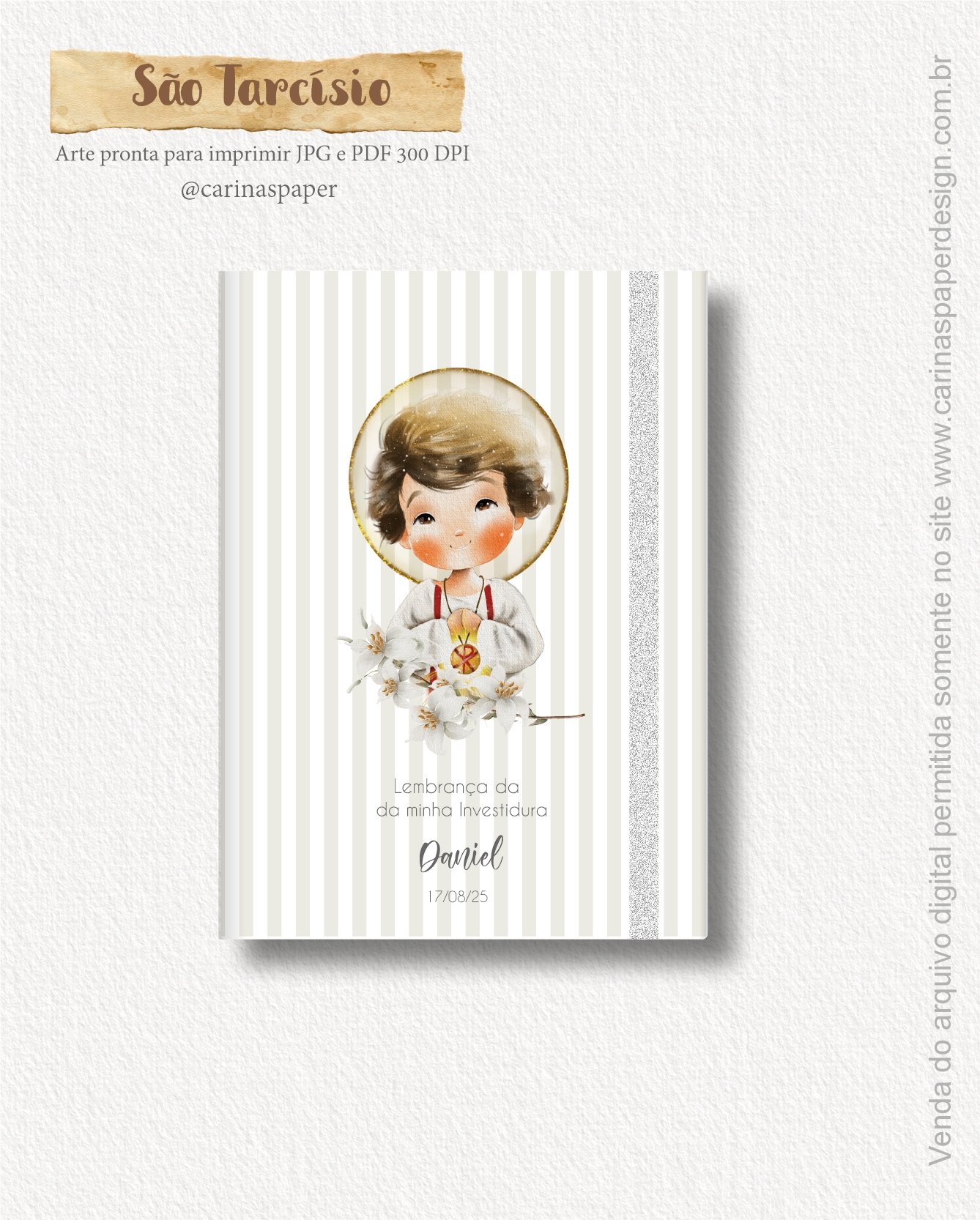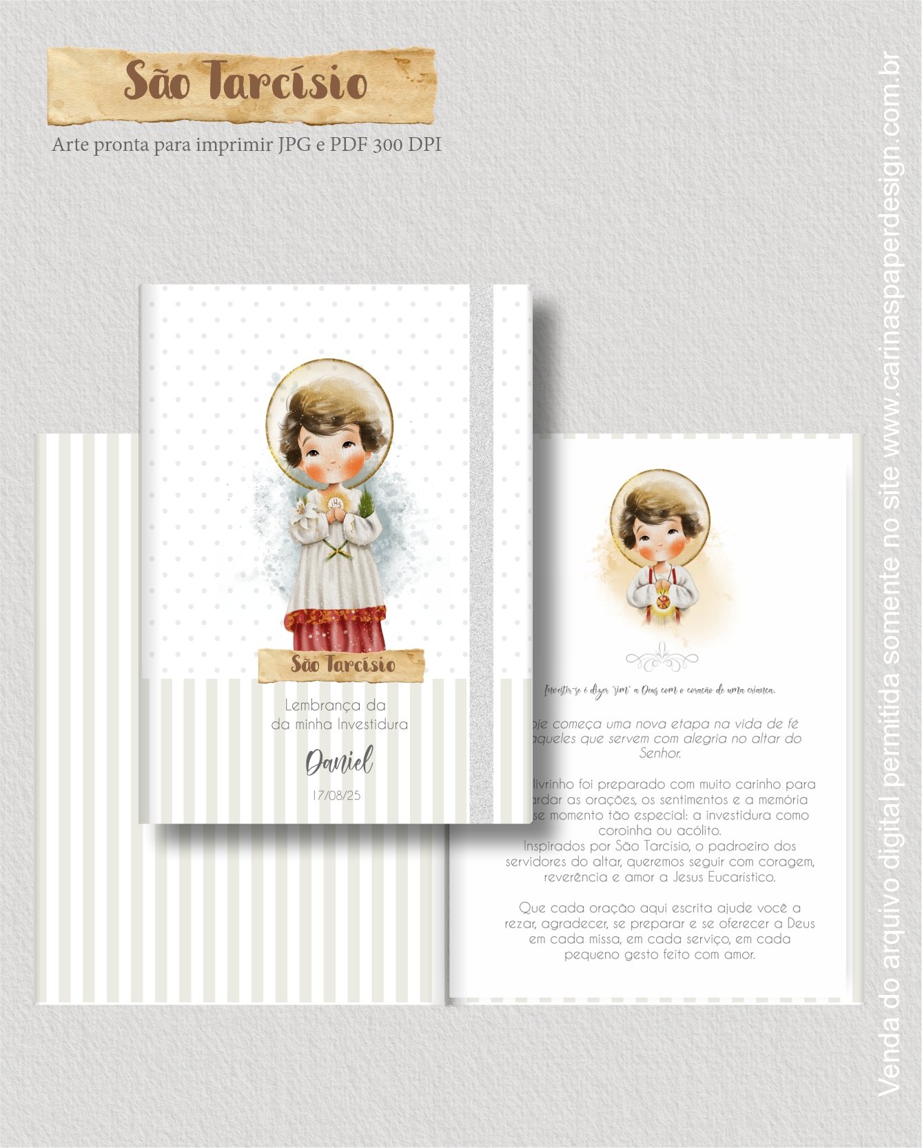 Em formato A6, práticos e econômicos de produzir, material trazem ilustrações fofinhas e devocionais de São Tarcísio, Perfeitos para produzir convites e lembrancinhas de Investiduras de coroinha.