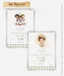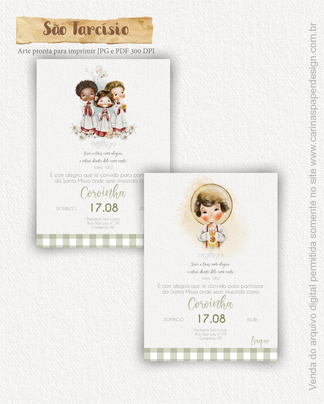3 artes para convites para Invistidura de coroinhas A6 (14,8×10,5 cm) com ilustrações de São Tarcísio em JPG pronto para preencher com informações do coroinha e imprimir