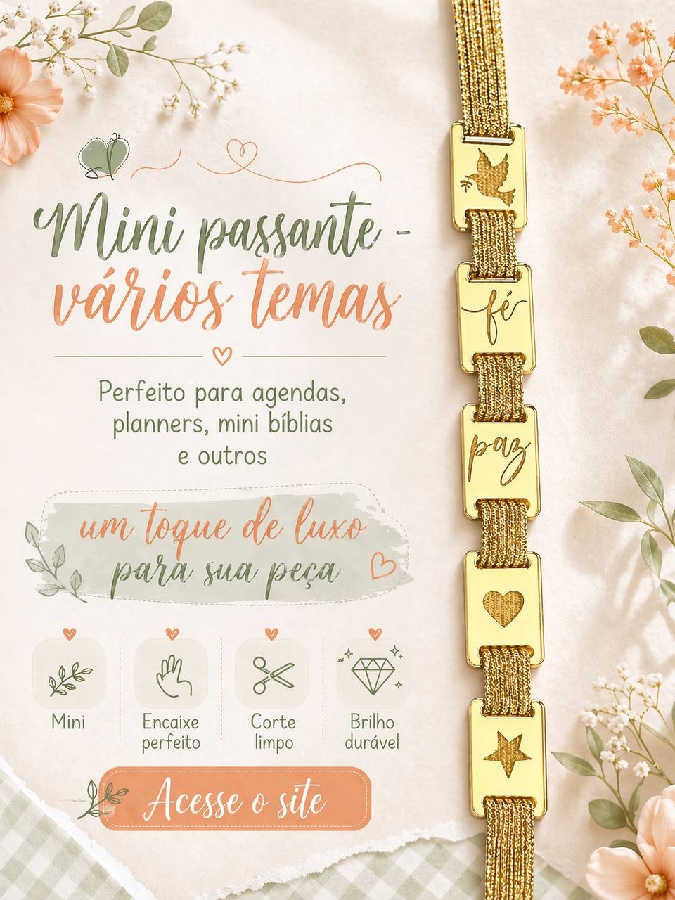 Sabemos que no mercado de papelaria personalizada, o detalhe é o que define o preço e a preferência do cliente. Este passante de acrílico espelhado não é apenas um acabamento; é um toque de sofisticação que valoriza imediatamente o seu trabalho. Ideal para quem produz Agendas de Oração, Diários Espirituais ou Planners Religiosos e outros. Essa peça foi desenhada para se destacar na capa, transmitindo delicadeza e luxo. O brilho do acrílico dourado cria um contraste perfeito tanto em capas coloridas quanto nas mais neutras, atraindo o olhar e o coração de quem recebe o produto.